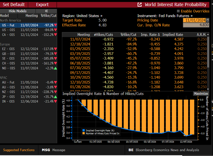 Last week’s marginally higher PCE and softer payroll report didn’t do much to deter the bond market from changing their opinion about next week’s FOMC meeting. The Fed Fund Futures are pricing in a 97% chance of a 25 bps cut and 80% chance of an additional cut at the December meeting.
