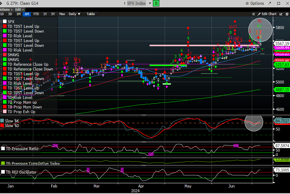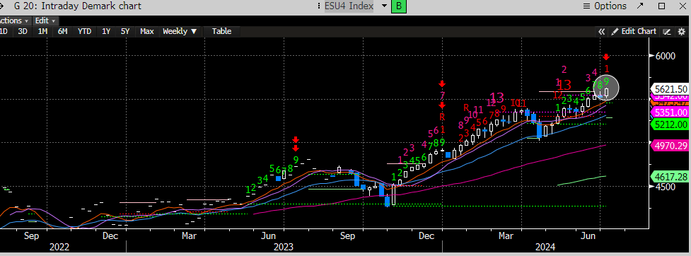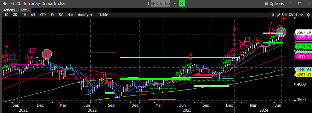 The SPX has now eclipsed the DeMark propulsion up target of 5534, and above our target range for a reversal. The weekly count printed the 9-weekly sell.