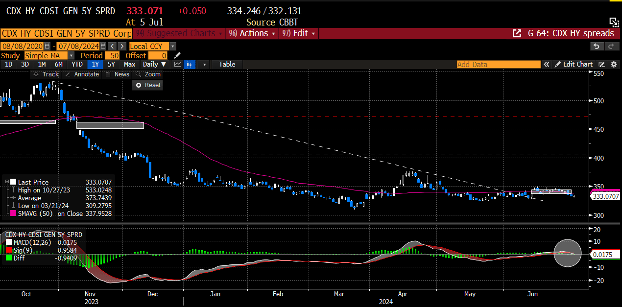 The CDX HY lost the gap window from the prior week, suggesting bears have lost power. Its MACD is now crossing back bearishly. This is also supportive of risk assets.