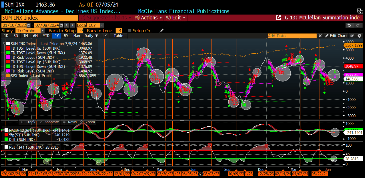 Recall our McClellan Summation Index (MSI) with DeMark signals, printed the seq 13 buy in the last week of June. This served as a reminder that market breadth could turn in the near term. The count has now flipped back up (day 2), and its MACD is about to cross bullishly.