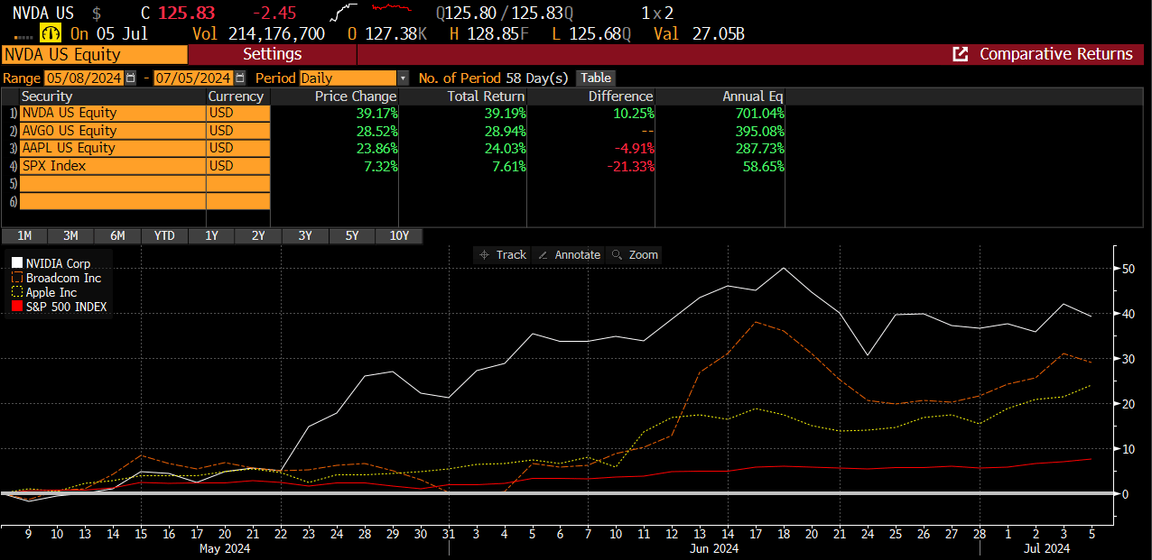 In our 5/8 report, we highlighted three single stocks for consideration: NVDA, AAPL, and AVGO.