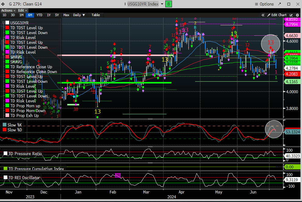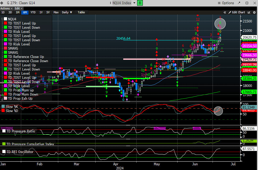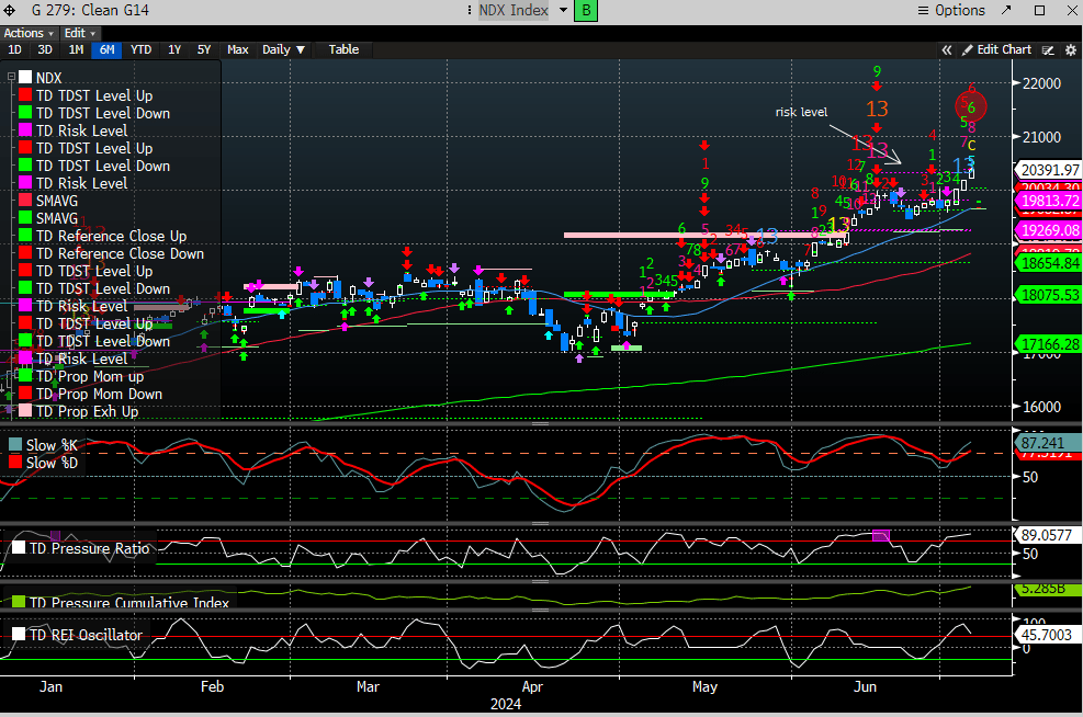 The daily chart for the NDX has marginally eclipsed the risk levels for the 13 sells that printed in mid-June. A new 9 sell can print in 3 days.