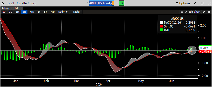 The MACD is back above the zero line for the first time since March. TSLA is the biggest holding so it’s possible it’s more related to its recent outperformance. Nonetheless, it is something to monitor as lower yields support higher valuations for growth stocks, even the ones that don’t make any money.