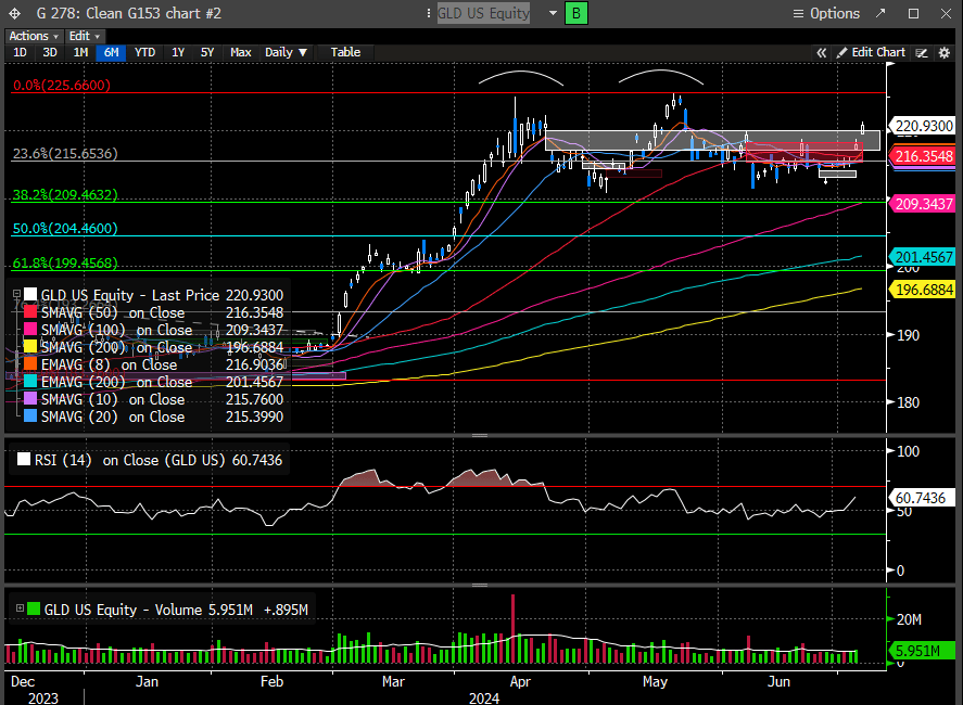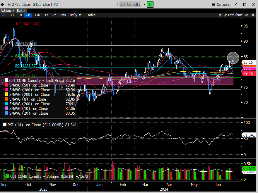 As we suggested, Oil did end up breaking the bull pennant pattern to test the 61.8% Fib retracement level. It has since been rejected, but those rejections appear mild. Breaking up would argue for a test of the 76.4% fib level (88.61). We remain bullishly biased.