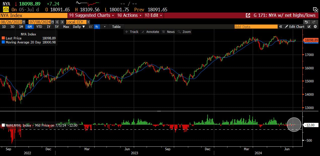 The NYSE Net New Highs Index continues to oscillate between positive and negative readings, indicating no sustainable trend.