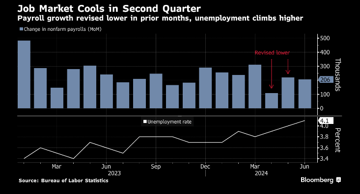 On Friday, we got a vital payroll report that saw the employment number rise to levels not seen since 2021. Payrolls rose by 206K, but the prior two month’s revision was substantial (-111K). This caused the unemployment rate to rise to 4.1%. In June, about 3/4’s of the job gains was in healthcare and government.