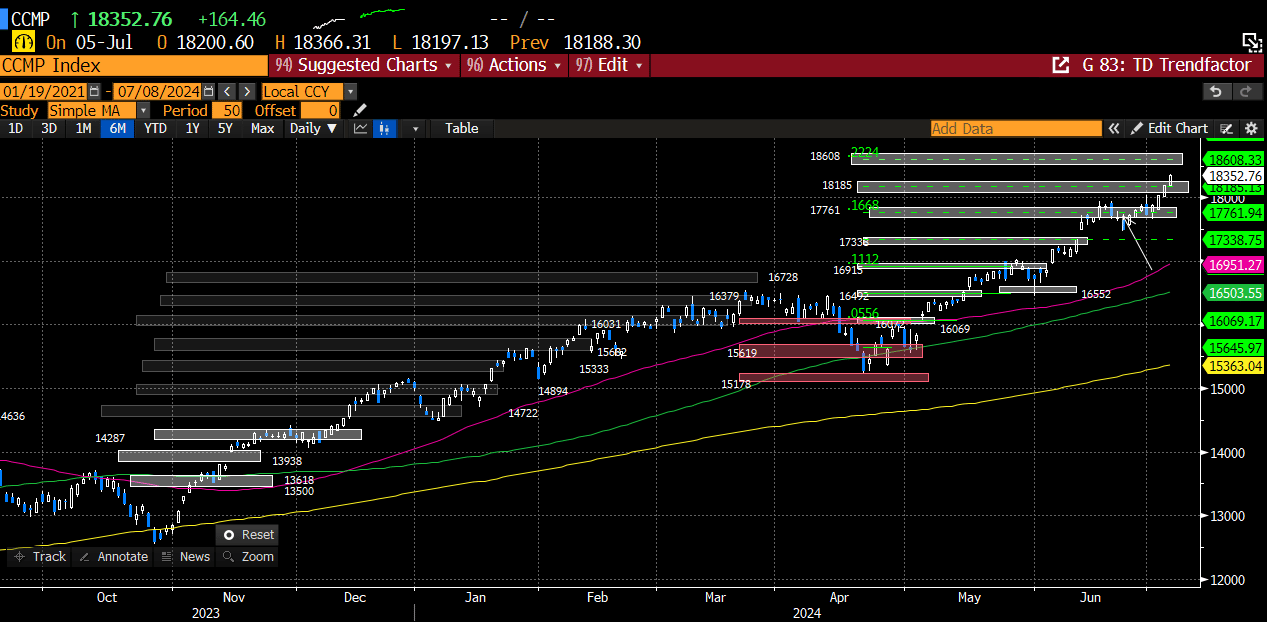 DeMark Trendfactor has done an incredible job at defining the levels of resistance. The 2x level was 5504, and the SPX struggled in the back half of June with taking out this levelis until last week. The 2.5x level is 5642, which offers some confluence with the Fib target highlighted above.