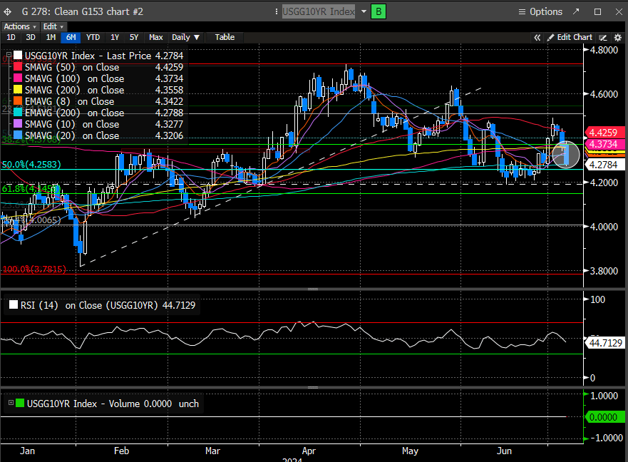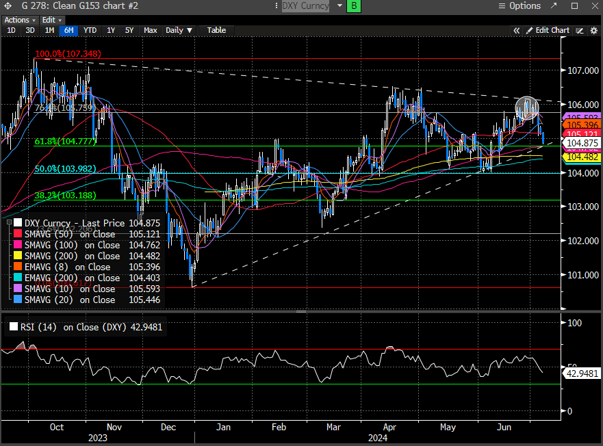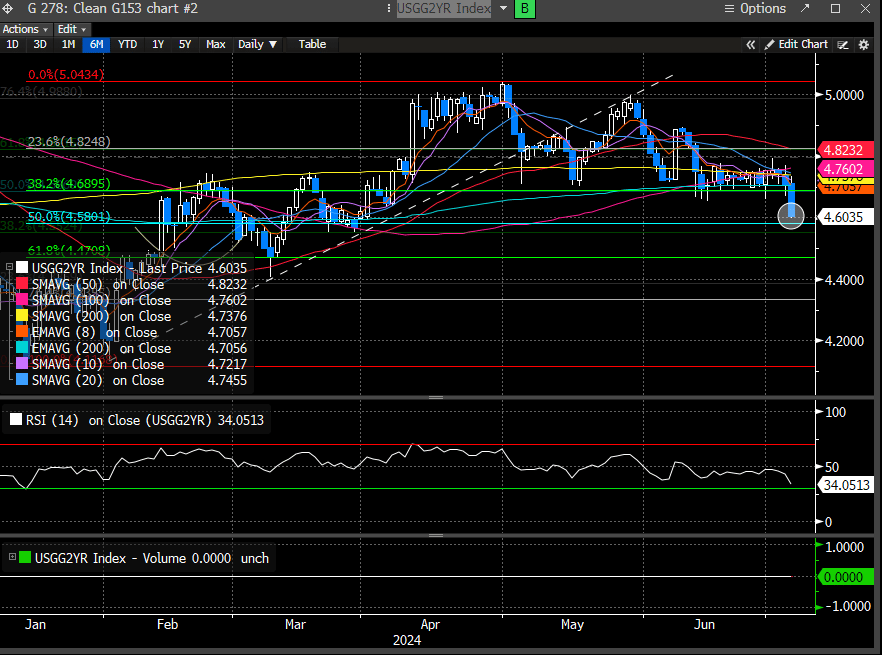 The 2-year yield has resumed its decline to forge a new swing low. This is quite important as the 38.2% Fib level was holding support for all of June. We are now testing the 50% level, but we suspect this will continue to grind lower. Our target remains 4.47 in the near term.