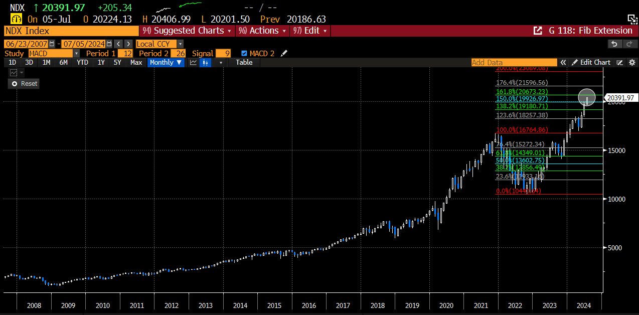 The NDX has a monthly 161.8% monthly Fib Extension at 20673 and would be a logical place to find resistance.