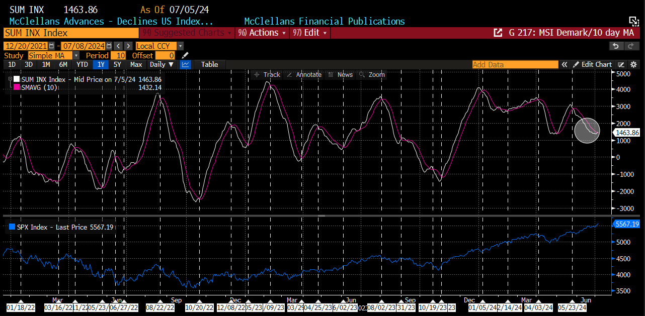 The recent DeMark 13 signals are three days from expiring, but a new 9 sell can print on Tuesday. While DeMark signals do a very good job of warning of potential trend change, we need to see more price degradation in the index before acting on them. For now, we see these as prominent warnings and to be prepared for a potential reversal. Maybe that comes in the back half of July when the seasonality window closes, and why we wrote last week to keep one foot out the door.