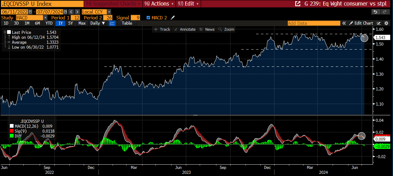 The equal-weight consumer discretionary vs. staples ratio failed to make a new high with the indexes last week, and it turned down. The MACD is also crossing bearishly. This could be an early warning sign that a defensive posture is building under the surface.