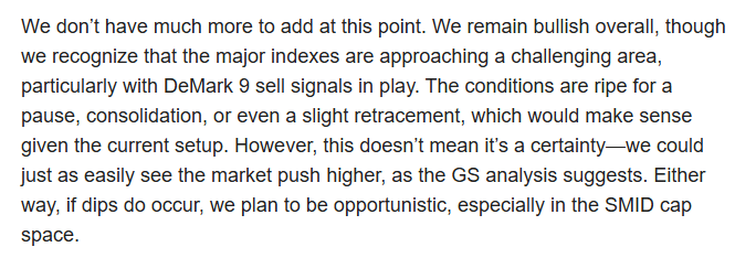 “We remain bullish overall, though we recognize that the major indexes are approaching a challenging area, particularly with DeMark 9 sell signals in play. The conditions are ripe for a pause, consolidation, or even a slight retracement, which would make sense given the current setup…if dips do occur, we plan to be opportunistic, especially in the SMID cap space.