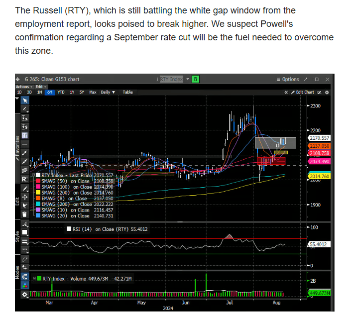 Both indexes dropped over 1% on Thursday, forming bearish engulfing candles. However, we anticipated that the Russell Small Cap (RTY) could outshine the large-cap indexes if Powell struck a positive tone during his Jackson Hole speech. Sure enough, the RTY surged over 3% on Friday.