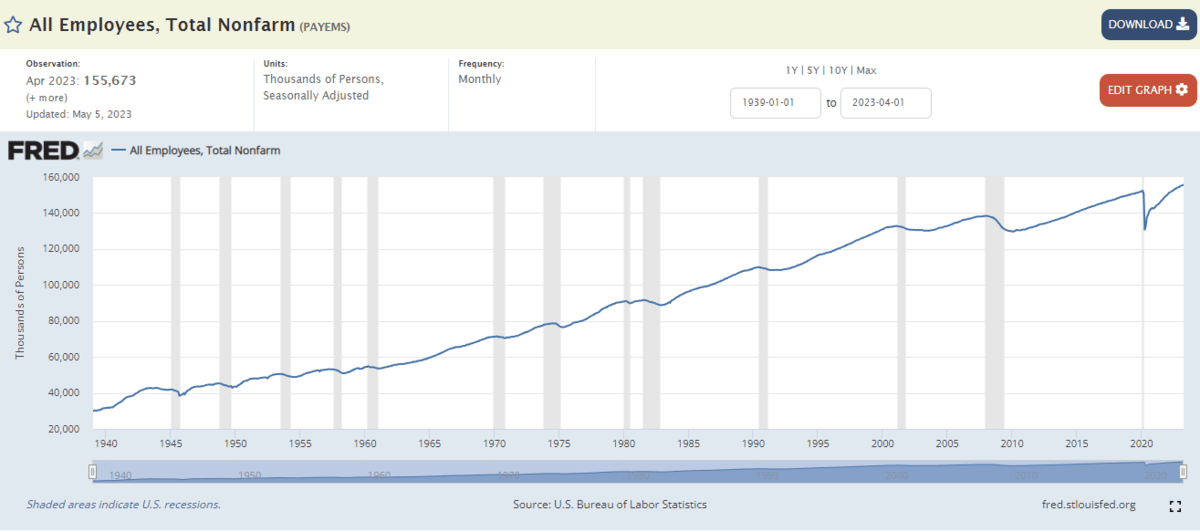 This is a chart from the St Louis Fed and demonstrates that employment drops only when recessions begin, and usually is the last metric to fall as companies try to hold on as long as they can before culling their staff.