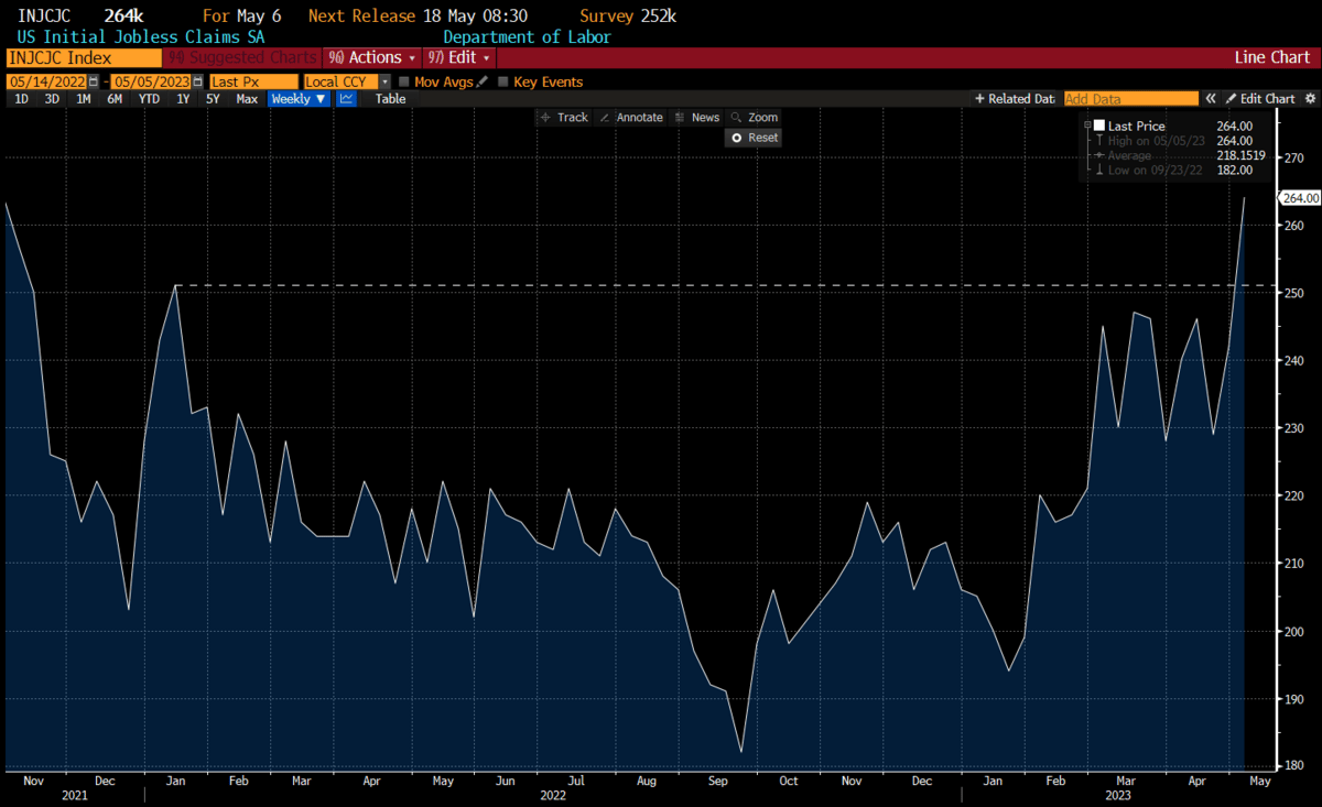 Jobless claims spiked last week and are now the highest since Jan ‘22. Remember, the payroll number is a lagging indicator, and jobless claims are leading.
