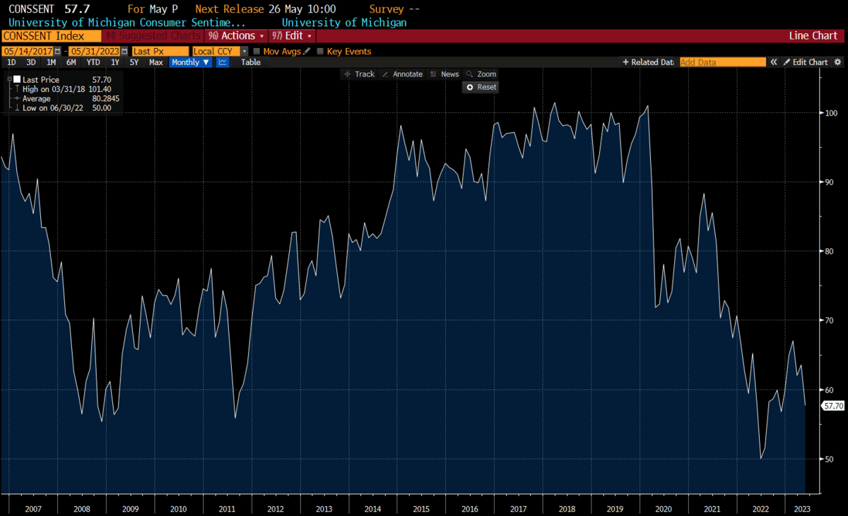 Last week’s consumer confidence missed the estimates by a wide margin (sentiment is a leading indicator). The University of Michigan’s latest survey showed the index plunged 5.8 points, to 57.7 vs expectations in the lows 60’s.