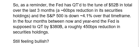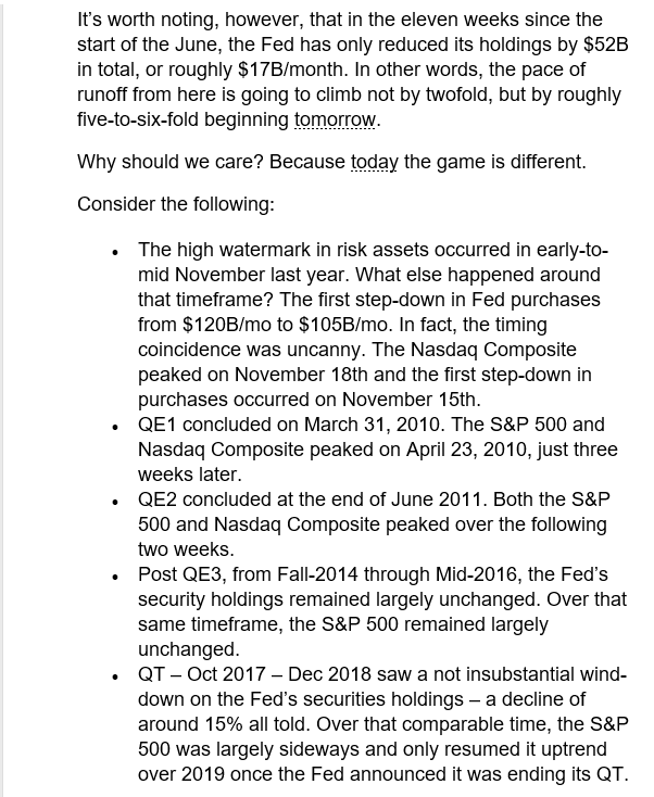 Powell and Co are firmly committed to reducing inflation by raising the Fed Funds rate and QT is about to double this month to $95B/month, or double the pace from Jun. To assess what QT could mean for the stock market, we are borrowing some work from the Hedge Eye Macro team: