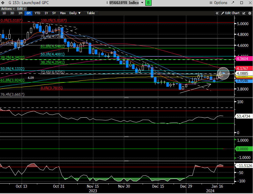 This was accompanied by higher treasury rates. The 10 year is now testing our 4.09 pivot and looks poised to break up.
