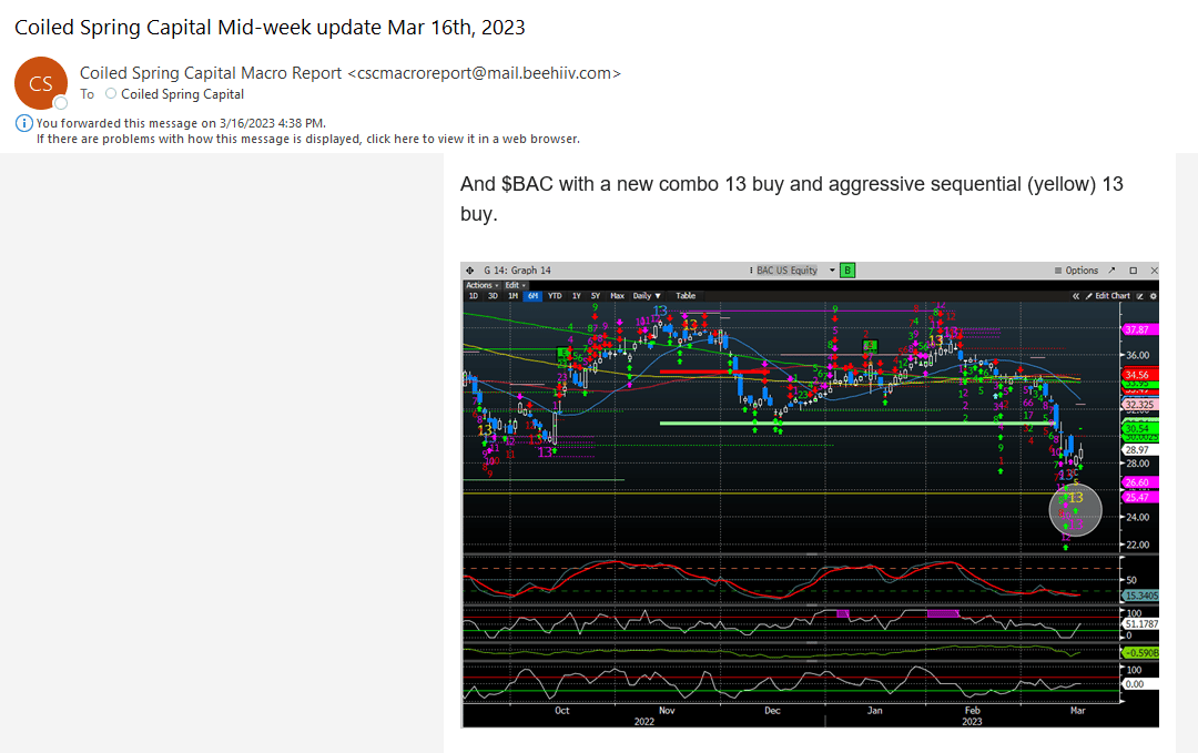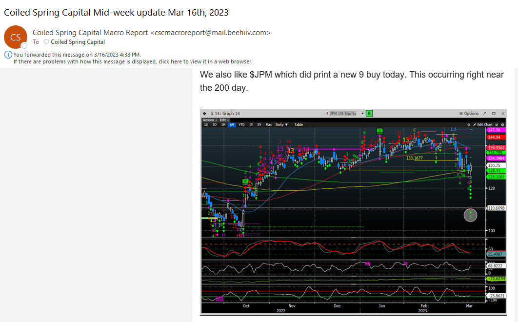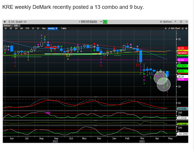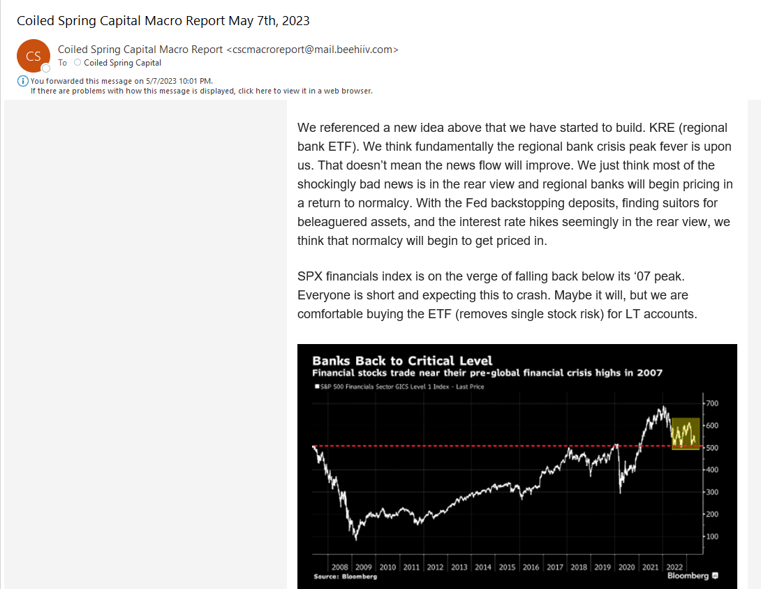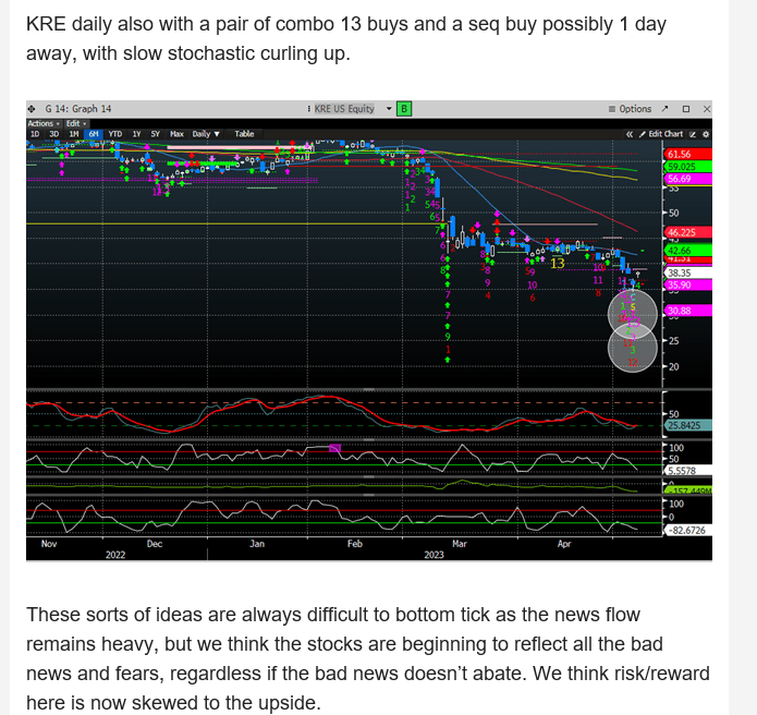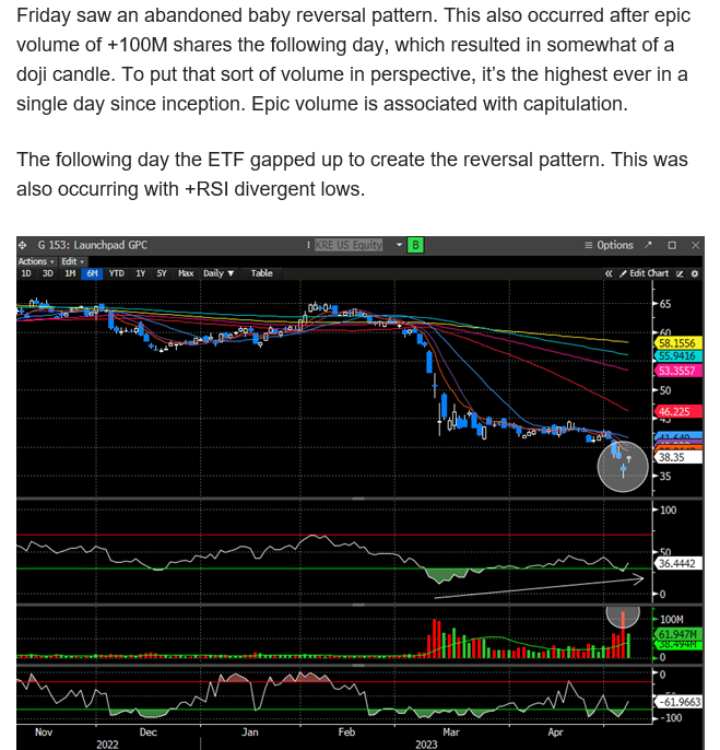 And this one is our favorites recently, as it bends all sorts of traditional technical analysis rules: $KRE (regional bank ETF) we presented back on May 7th when everyone else was running for the hills. Keep in mind we come from a fundamental background, so the combination of technical and fundamental logic helps us more accurately assess when things are overdone. We are currently still long but our price target range is $49/$53 so we will be trimming/selling into that range. Currently the position is up +25%.