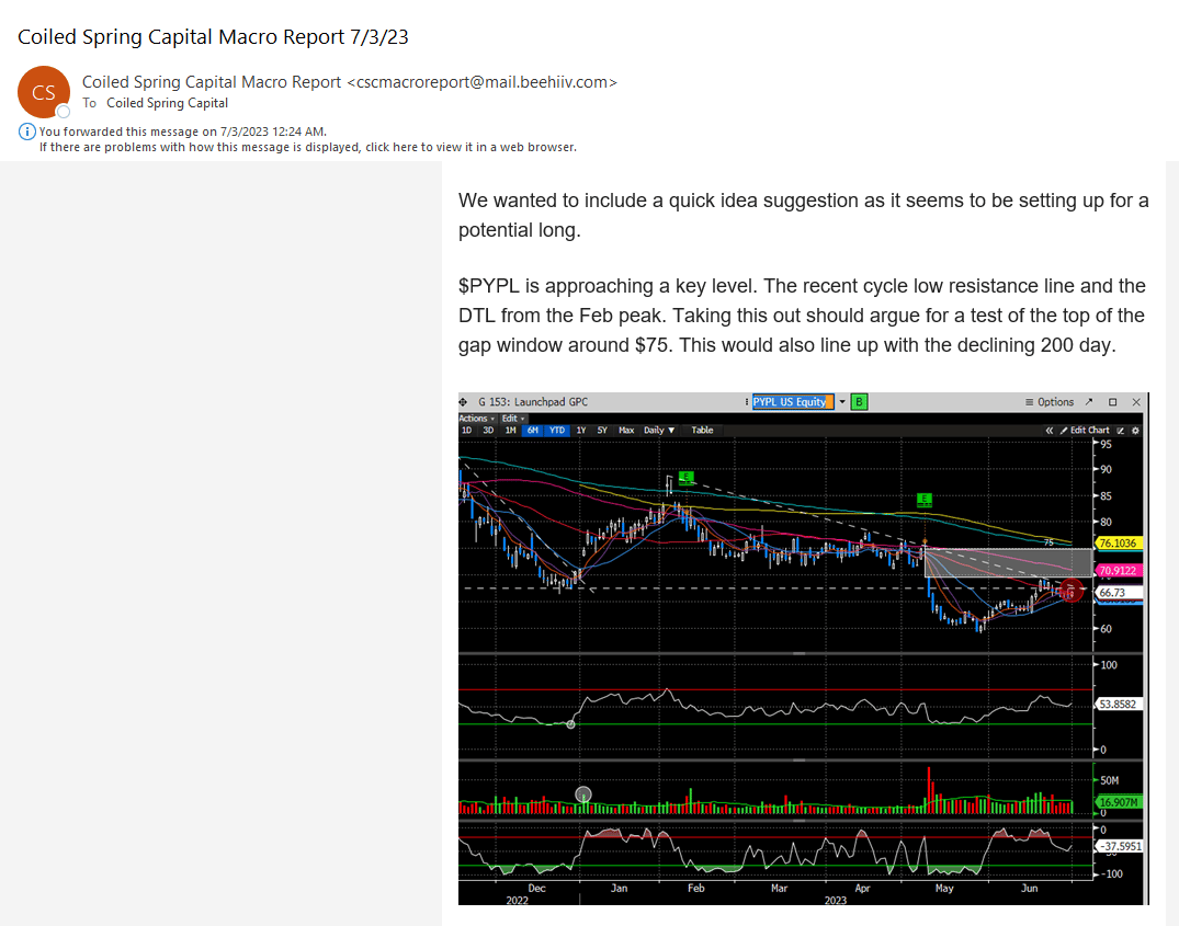We also closed out $PYPL today for +12% as it hit our precise target at $75. We presented this idea on 7/3. Here is an excerpt: