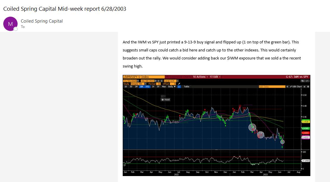 We will be also be closing out the $IWM portion of our pair trade (IWM vs QQQ) that we added back on 6/28. This is now up +7%. Here is that excerpt: