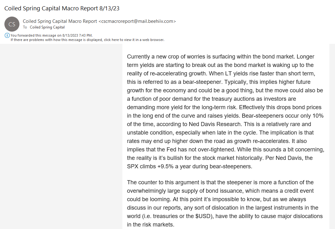 Currently, LT Treasury yields are exploding higher. We wrote about this in the weekend report as a major new risk for the equity markets to digest. Here is the excerpt from that report: