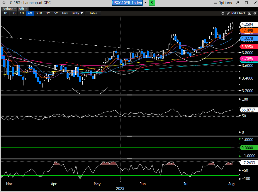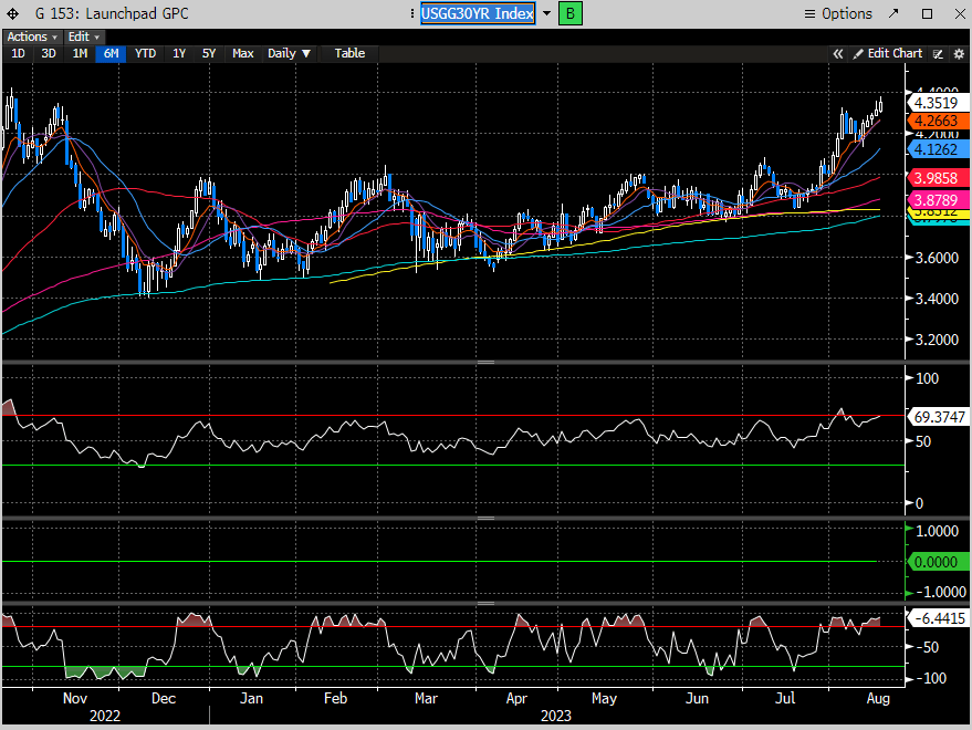And since that report, the yields for long term treasury paper continue to press higher, where the 10 year is now the highest since Nov of last year.