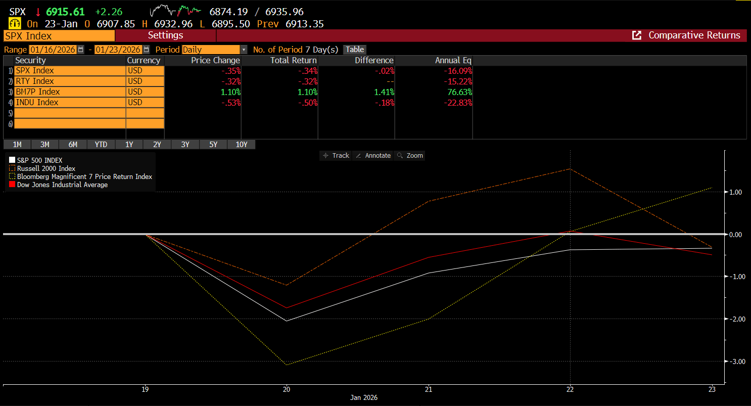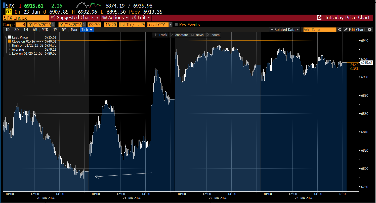 Another week has passed, and once again the macro backdrop feels like a high-stakes dodgeball game where the curveballs keep coming faster than markets can digest them. Last week’s flashpoint began with Denmark and Trump’s incendiary remarks about acquiring Greenland — comments that were quickly walked back at Davos — only for attention to shift almost immediately to a new front. Over the weekend, tensions escalated with Canadian Prime Minister Mark Carney, including the administration floating the possibility of 100% tariffs on Canada should they move forward with a trade agreement with China. In an environment like this, separating signal from noise becomes nearly impossible, and markets are left to price uncertainty without a reliable framework.
