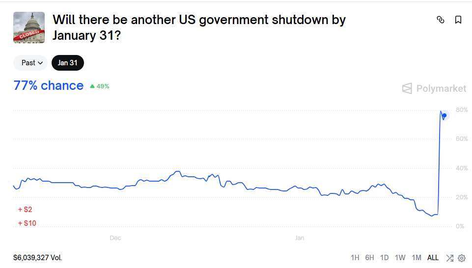 According to Polymarket, the probability of a government shutdown by July 31st has surged to 77%, underscoring just how elevated political risk has become — and why markets remain on edge.
