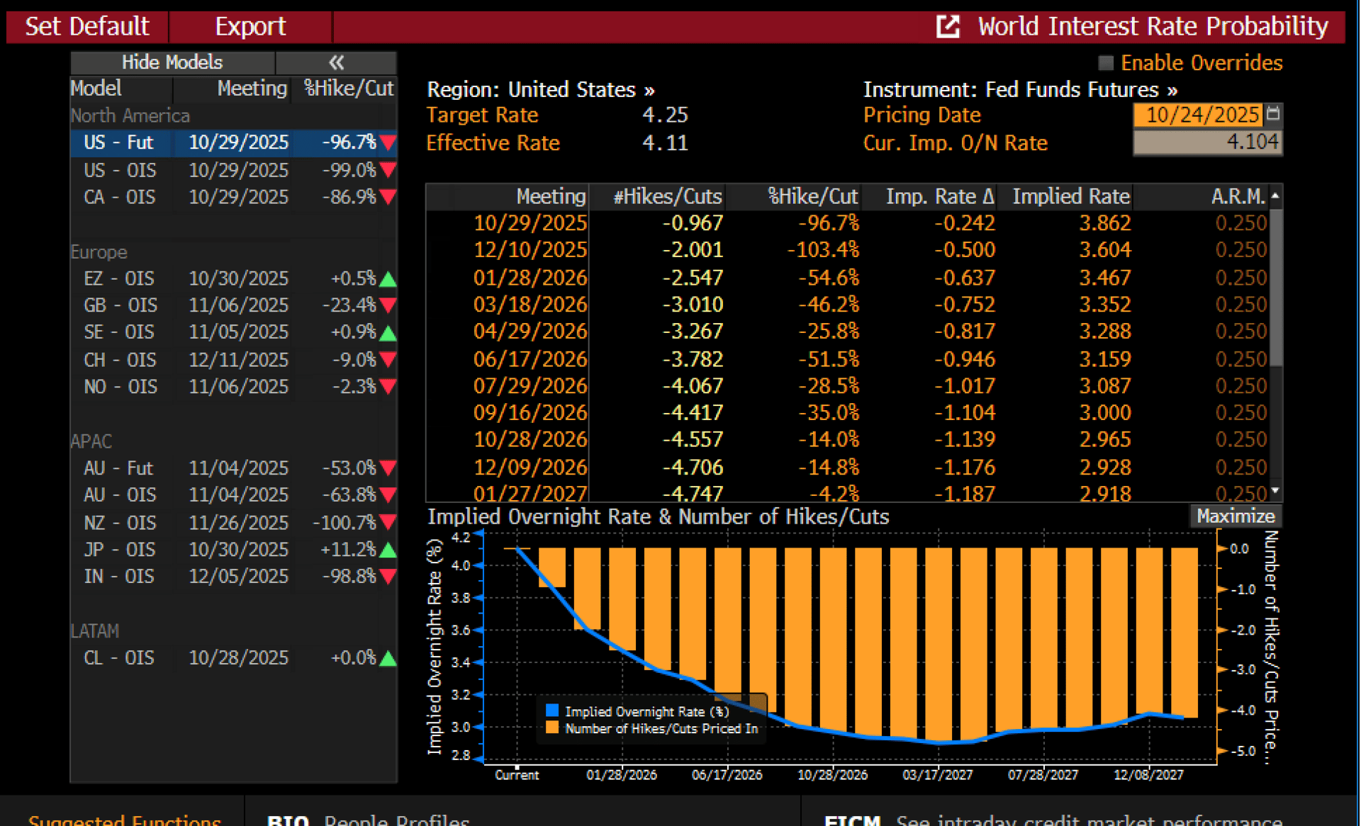 This week brings heavy event risk: the Federal Reserve decision, earnings from the Mag 7, and major S&P 500 Index companies. A benign Friday CPI print gave the Fed room for further rate cuts. If they stray from that narrative—expect turbulence. But we view such a deviation as low probability, given the backdrop: rising unemployment trends, credit-fear still alive, inflation manageable. As of now, Fed Funds futures price in a 100% chance of two more cuts by year-end.