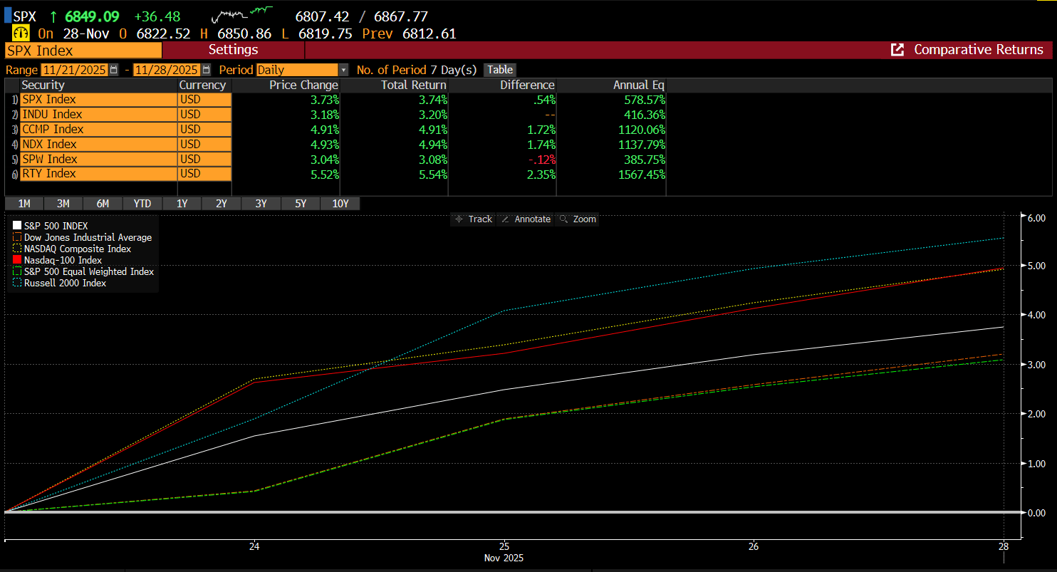 In a week that barely counted as a full trading stretch—just three and a half sessions—the market didn’t tiptoe higher; it charged. Most major indexes clawed back the entirety of November’s decline and now sit within arm’s reach of the all-time highs recorded at the end of October.