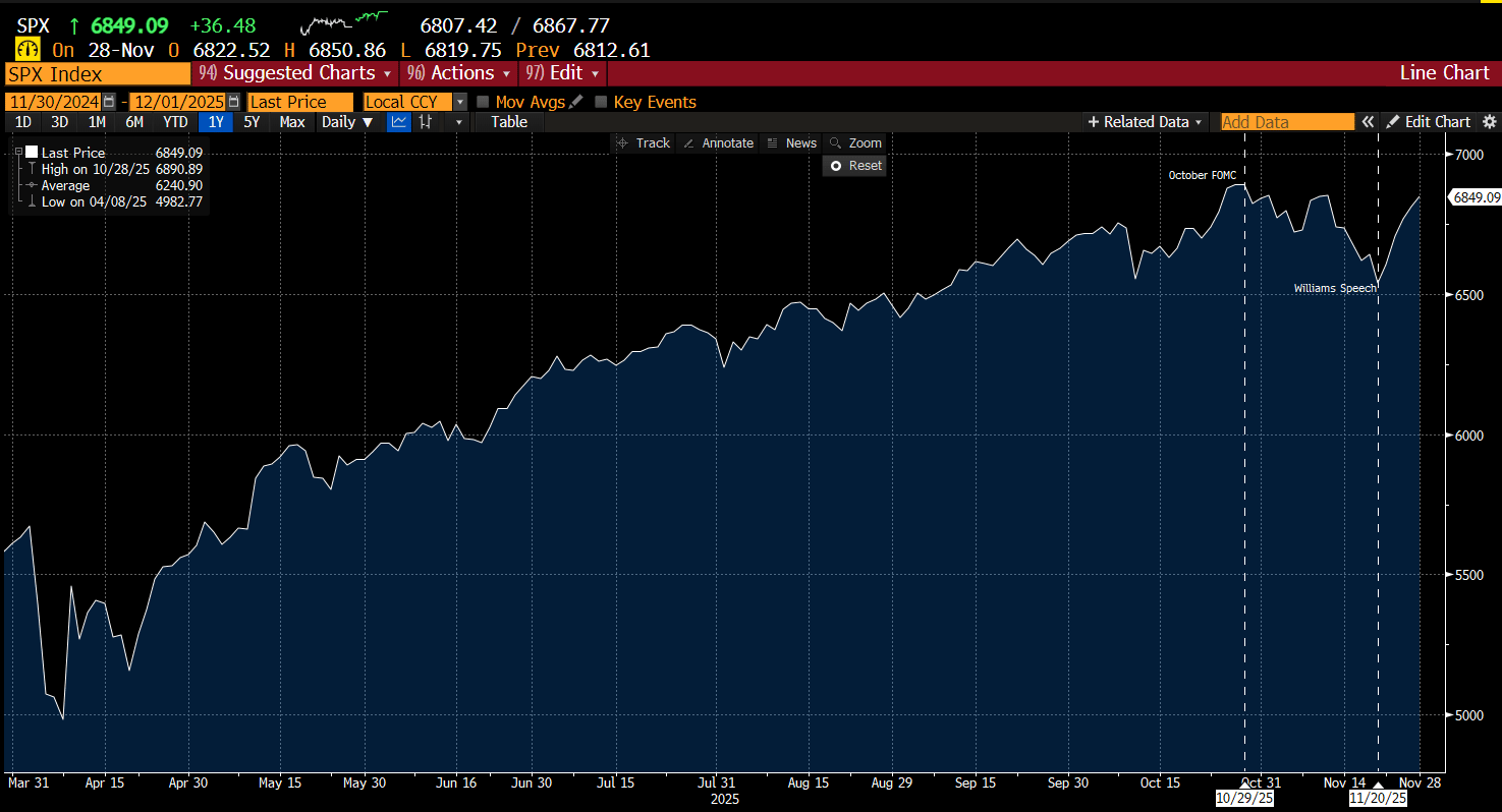 Consider this: the precise top in the S&P 500 coincided with the last FOMC meeting, when Powell made it clear a December cut was far from guaranteed. The market’s aggressive, V-shaped rebound didn’t materialize out of thin air—it began the moment Williams spoke on November 20th.