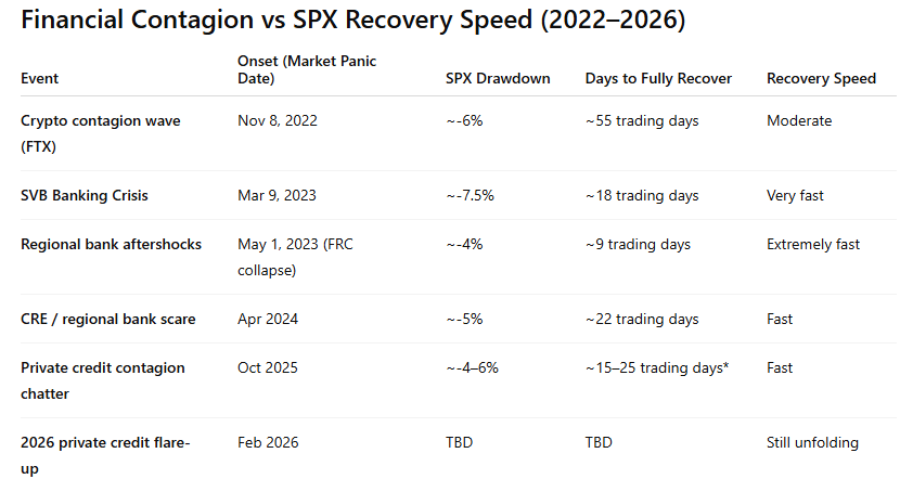 The table below highlights the major financial contagion episodes since 2022 and the subsequent recovery speed in the S&P 500. The takeaway is fairly clear: outside of 2022 — which unfolded in the middle of a bona fide bear market — the median recovery time has been roughly 2–4 weeks.