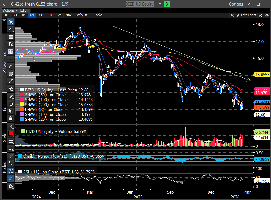 The closest public proxy for tracking stress in private credit is the BDC ETF (BIDZ). As the chart illustrates, BIDZ has been under pressure for nearly two years. This is not a new development, nor one that institutional investors are just now discovering. By most measures, this is a mature decline.