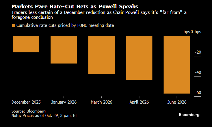 In a surprisingly hawkish press conference, Powell downplayed the odds of a December cut, jolting markets that had priced in near certainty only a week ago. Fed Fund Futures dropped from a 99% probability to just over 70%. Is this a derailment of the easing cycle? Probably not — the broader rate-cut trajectory remains intact — but it’s a sharp reminder that monetary policy still dances to Powell’s rhythm.