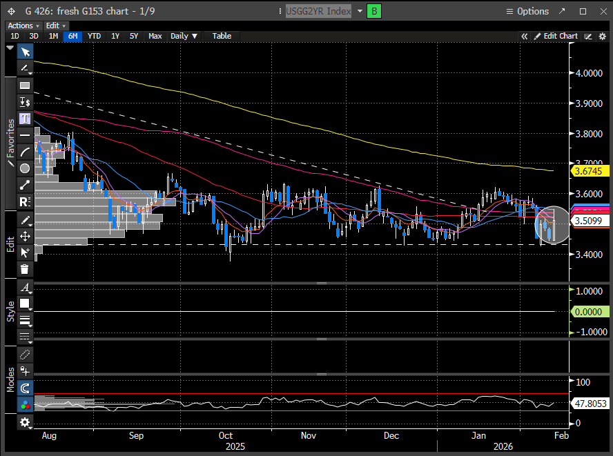 The payroll surprise once again reshuffled rate-cut expectations. What had been nearly a 100% probability of a June cut has now been pushed into July. It’s not a dramatic shift, but the rates market reacted nonetheless, with the 2-year Treasury bouncing cleanly from our identified pivot support.
