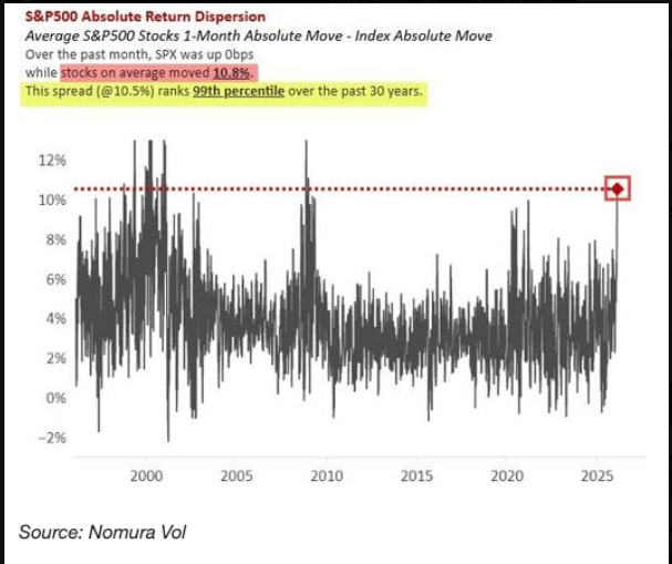 The chart below, courtesy of Nomura, highlights just how extreme the current dispersion is—ranking in the 99th percentile over the past 30 years.