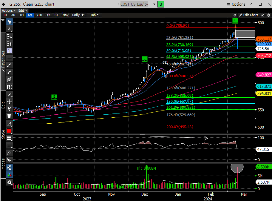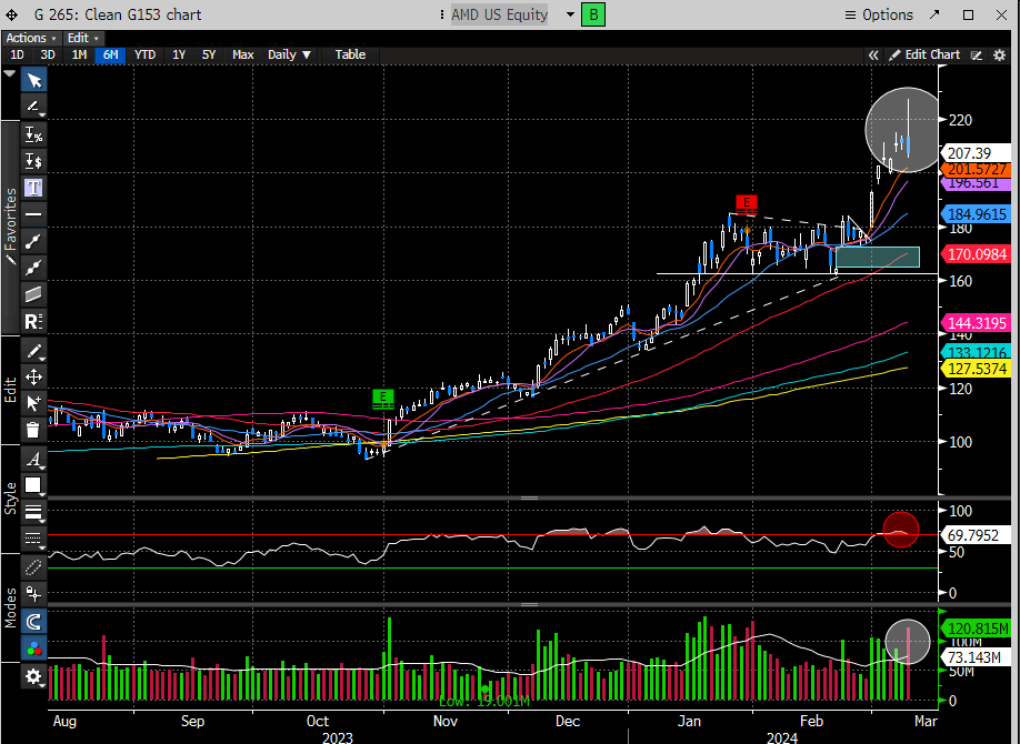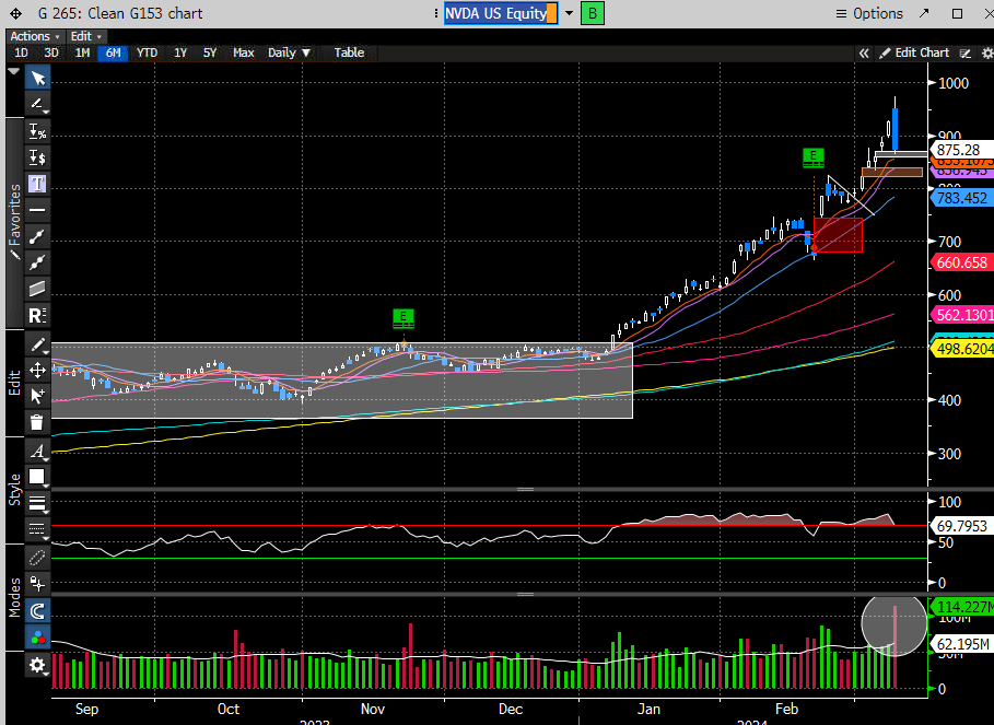 NVDA, which has propelled the stock market to new heights, abruptly reversed on Friday to close near the lows. Friday’s candle is considered a bearish englufing candle and occurred with the highest volume in almost a year.
